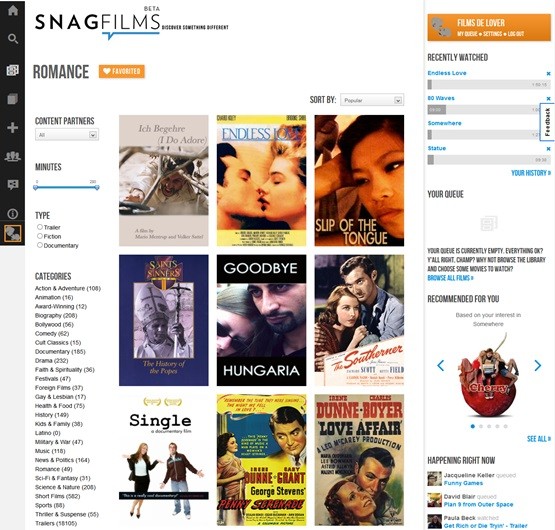 Le principal atout de SnagFilms est sa gratuité, que l'on paye moyennant quelques publicités. Principalement dédié au marché US, il se peut que certains films soient uniquement visibles depuis les Etats-Unis via la plate-forme Hulu (restriction géographique contournable grâce à l'ajout d'une extension sur Firefox). La grande force de SnagFilms est qu'il appartient à la même famille média que IndieWire, le site US de référence sur les films indépendants, ce qui garantit tout de même un minimum de qualité. Dans tous les cas, il mérite d'être essayé, même si son ergonomie n'est vraiment pas tip top.