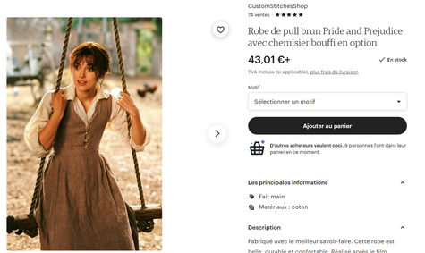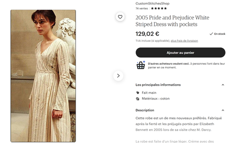 Depuis que j'ai mentionné au début de cet article que certaines personnes s'habillaient parfois, à l'occasion, comme Mr Darcy pour parcourir la campagne normande (ou n'importe quelle autre campagne, je ne sais pas pourquoi je parle de la campagne normande en particulier), vous vous êtes aussi dit : "Et si je m'habillais comme Lizzie Bennet ?". Cela tombe bien, d'autres personnes y ont pensé sur Etsy et vendent des répliques des habits de l'héroïne du film qui s'achètent entre 40 et 150€. Une affaire assurément.