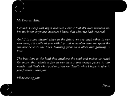 L'histoire d'amour entre Allie et Noah est sûrement l'une des plus belles présentes sur ce site, entre une fille de bonne famille et un homme qui n'a que ses rêves et ses mains pour survivre. Il possède également une jolie plume.