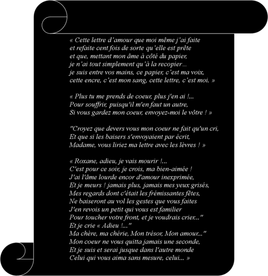 Toute la poèsie d'Edmond Rostand transparaît dans ce film qui comprend quelques extraits de lettres composées par Cyrano de Bergerac pour la jeune et jolie Roxane.