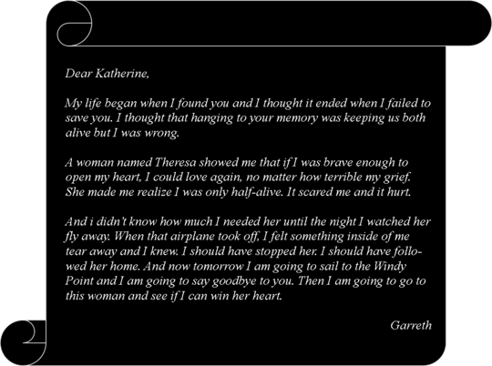 Je ne savais pas à quel point j'avais besoin d'elle jusqu'à cette nuit où je l'ai regardée s'envoler loin de moi. Quand l'avion a décollé, j'ai senti quelque chose se déchirer au fond de moi et j'ai su. J'aurais dû l'en empêcher. J'aurais dû partir avec elle. C'est pourquoi demain je vais naviguer jusqu'à Windy Point et je vais te dire au revoir. Puis j'irais voir cette femme pour tenter de reconquérir son coeur. Garreth."