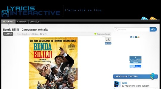 Lyricis Interactive n'est ni plus ni moins que LE blog d'actus sur le cinéma. Bandes-annonces, jeux-concours, dernières actualités, tout ce qu'il faut savoir sur le cinéma en général est là-bas.