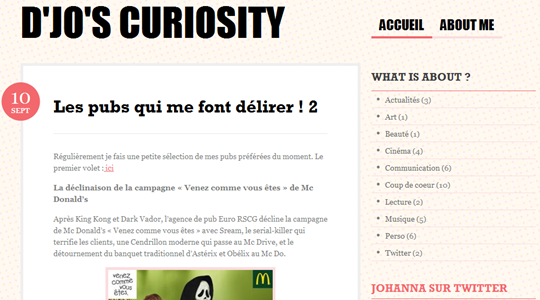 Etudiante en communication, Djoanita (aka Johanna) fait partager ses coups de coeur pub, cinématographiques, littéraires et musicaux dans son blog très sympa graphiquement.