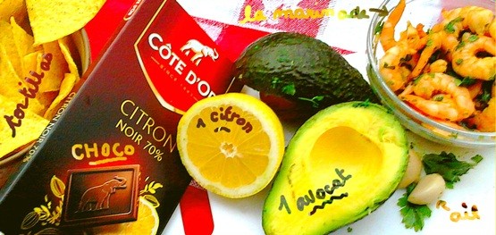 Dans un autre récipient, on mélange ensuite le fromage blanc avec un peu de jus de citron, de la coriandre, du poivre et une pincée de sel, et de l'ail finement haché. Puis, y'a l'avocat qui se fait émincer, les carrés de chocolat qui se font découper. Un carnage. Ca devient pire après, parce que les tortillas sont écrasées et mélangés aux crevettes dans la marinade.