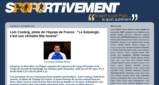 Comme son nom l'indique plutôt bien, "Spoportivement" est le blog de Pauline dédié uniquement au sport, à tous les sports. Interviews, reportages, infos, vous y trouverez plein de choses à lire, que ce soit sur le bobsleigh, les sports de glisse, le tennis, tous les sports on vous dit !