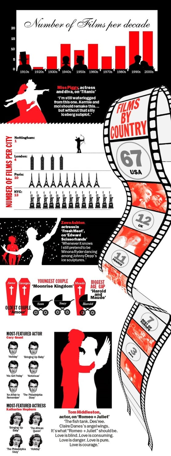 Voici une petite infographie en anglais faite par "TimeOut" qui récapitule en chiffres les résultats. On peut y constater une majorité de films des 90's et des années 2000 ce qui est quand même plutôt étrange, au moins pour les 2000. Mais c'est aussi une preuve que le film romantique n'est pas mort, loin de là.