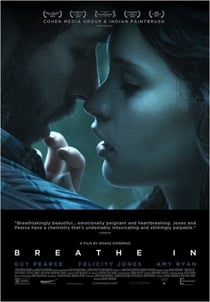 J'ai vu aussi "Breathe In" en VO!! intense, magnifique, de l'émotion à l'état pur! Felicity Jones est lumineuse, une jeune actrice anglaise qui a tout d'une grande et Guy Pearce que je découvre dans ce film pour la 1ère fois...un beau film d'amour, avec une sensualité et une sensibilité incroyables!! on croit très fort aux sentiments qui animent les personnages! la forte attirance entre les 2 personnages principaux est palpable et pas besoin de grandes scènes de sexe pour le montrer!!! et la musique est à l'image du film, sublime!!! par contre, comme Like Crazy, du même réalisateur, c'est singulier comme film, rien à voir avec la plupart des films d'amour américains! ce sont es films qui poussent à la réflexion!!!