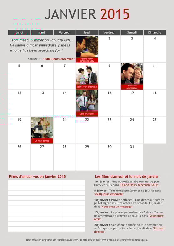 Les jours sans films, ce sera à vous de noter vos divers rendez-vous galants et on a même prévu un endroit en bas pour que vous puissiez noter les films d'amour que vous verrez en janvier. Bien