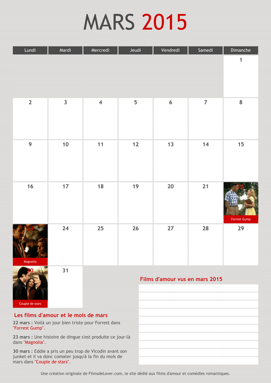 Et voici le calendrier Lover du mois de mars 2015 à télécharger et imprimer chez vous ! Son principe est simple et dérivé de notre calendrier perpétuel : il vous donne les films d'amour à regarder au jour le jour selon que le jour en question a une importance dans l'intrigue. C'est à dire que si vous regardez "Forrest Gump" le 22 mars, vous verrez la date du jour dans le film, histoire d'être synchronisé au maximum avec le film. Les jours sans films, ce sera à vous de noter vos divers rendez-vous galants et on a même prévu un endroit en bas pour que vous puissiez noter les films d'amour que vous verrez en mars.