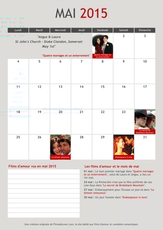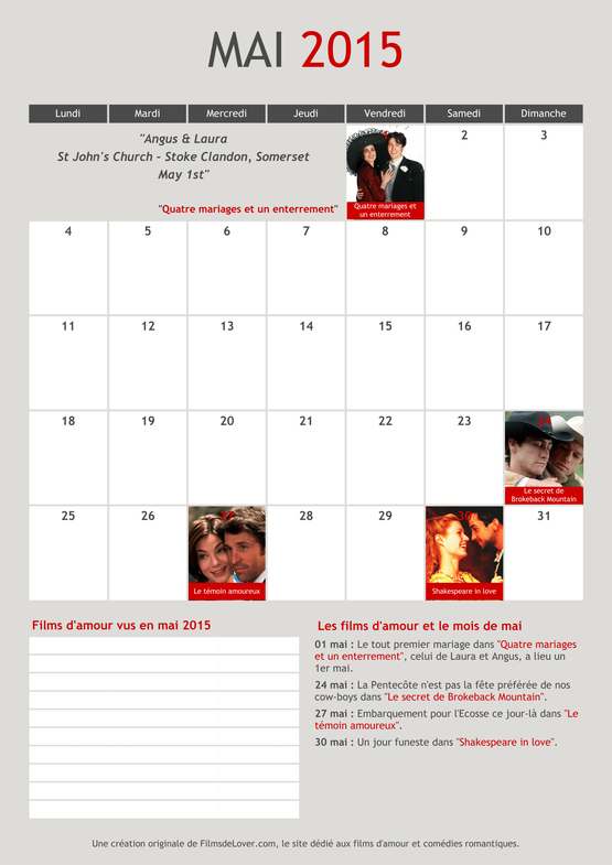 Et voici le calendrier Lover du mois de mai 2015 à télécharger et imprimer chez vous ! Son principe est simple et dérivé de notre calendrier perpétuel : il vous donne les films d'amour à regarder au jour le jour selon que le jour en question a une importance dans l'intrigue. C'est à dire que si vous regardez "Quatre mariages et un enterrement" le 1er mai, vous verrez la date du jour dans le film, histoire d'être synchronisé au maximum avec le film. Les jours sans films, ce sera à vous de noter vos divers rendez-vous galants et on a même prévu un endroit en bas pour que vous puissiez noter les films d'amour que vous verrez en mai.