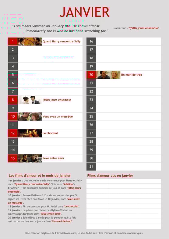Son principe est toujours le même : il vous donne les films d'amour à regarder au jour le jour selon que le jour en question a une importance dans l'intrigue. C'est à dire que si vous regardez "This time tomorrow" le 21 décembre, vous entendrez la date du jour dans le film, histoire d'être synchronisé au maximum avec le film. Donc il ne vous reste plus qu'à le télécharger, l'imprimer (pas très COP21 mais bon) et vous aurez votre calendrier 2016 aux couleurs de FilmsdeLover avec des idées de films romantiques à regarder pendant l'année.