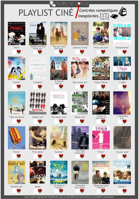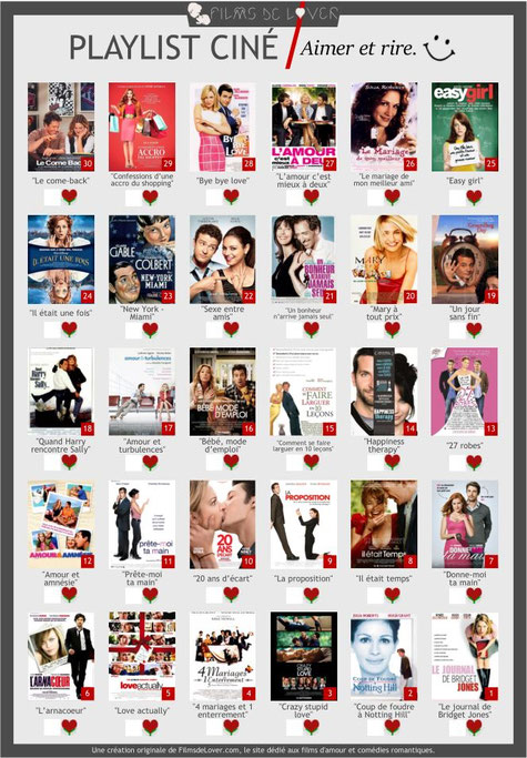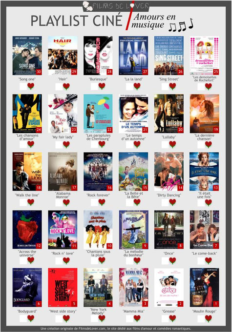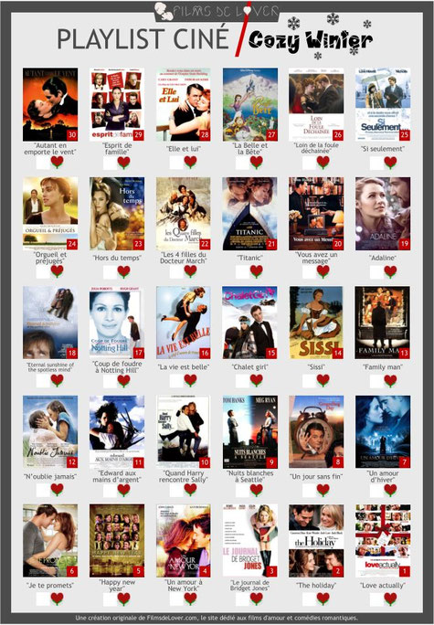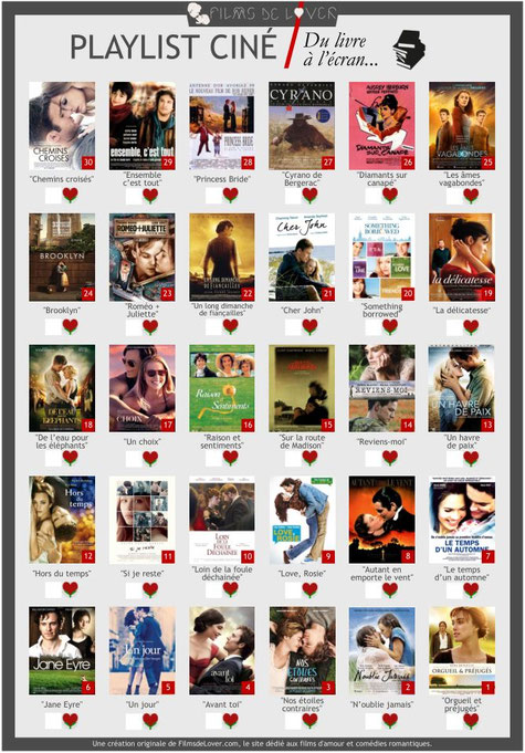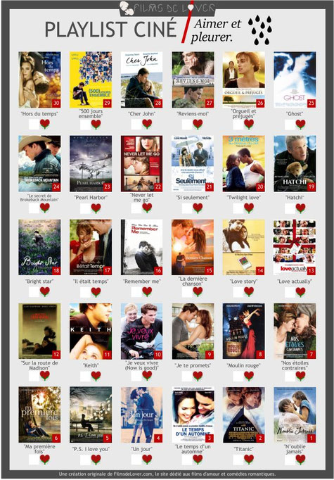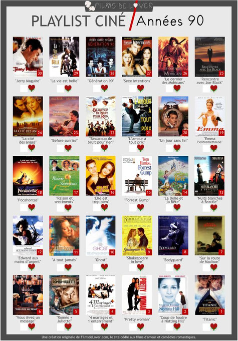 En ce début d'année 2018, nous avons décidé de concevoir des playlists ciné et de vous les proposer en téléchargement pour que vous puissiez vous lancer des challenges de cinéma romantique tout au long de cette année et pourquoi pas les années prochaines. En quoi consistent nos playlists ? C'est très simple : sur une feuille prête à être téléchargée et imprimée, nous avons listé 30 films d'amour selon des thèmes ou des centres d'intérêts bien spécifiques en nous basant sur nos divers classements établis par les réponses de nos Lovenautes.
