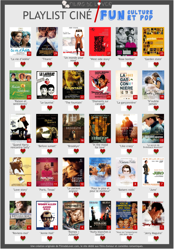 Nos playlists romantiques sont autant d'invitations à vous lancer dans des challenges cinés de films romantiques. Imprimez les playlists, regardez tous les films, notez-les et passez à la playlist suivante. Un outil parfait si vous ne savez plus quoi regarder ou par quoi commencer. En 2018, nous essayerons d'en publier une nouvelle toutes les deux semaines et vous pouvez les retrouver toutes sur notre page dédiée.