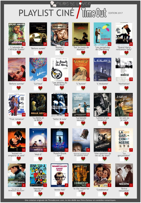 La playlist du jour nous vient de TimeOut, le célèbre magazine des sorties londoniennes qui avait publié en 2017 son classement des meilleurs films d'amour selon eux. Voici les 30 premiers réunis dans une playlist à télécharger, imprimer et peut-être remplir !