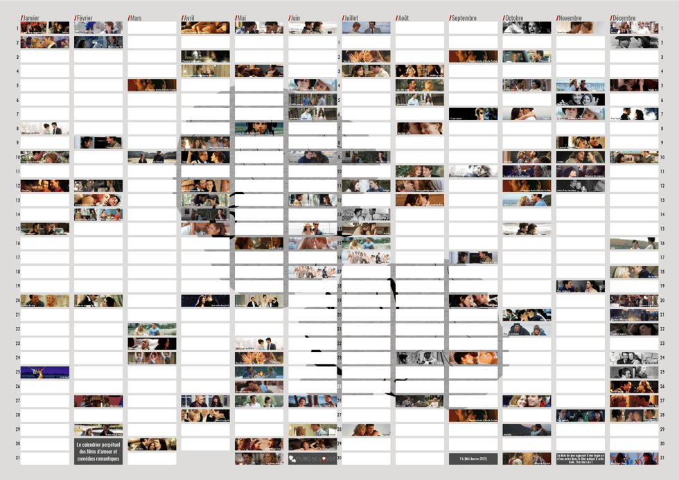 Nous avons déjà souvent parlé de notre calendrier perpétuel des films d'amour et comédies romantiques. Cette version est d'ailleurs la troisième en 5 ans si je ne m'abuse mais que voulez-vous, on a vraiment envie de perdre du temps à vous créer des petites choses. Je rappelle le principe de ce calendrier perpétuel : si un film est indiqué à une date précise, c'est que cette date apparait d'une façon ou d'une autre dans ledit film. Cela peut être dans un dialogue ou à l'écran, parfois de façon explicite mais aussi parfois de façon implicite. Nous avons mis à jour le calendrier par rapport aux éditions précédentes avec quelques nouveaux films.