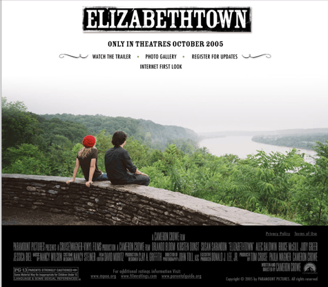 Vous vous souvenez quand les films avaient de beaux sites officiels sur Internet avec des goodies, des trucs à télécharger etc. Celui de Rendez-vous à Elizabethtown était sans doute en Flash parce qu'on ne le trouve plus nulle part mais la Wayback Machine d'Internet Archive a conservé le site teaser même si plus rien ne fonctionne dessus.